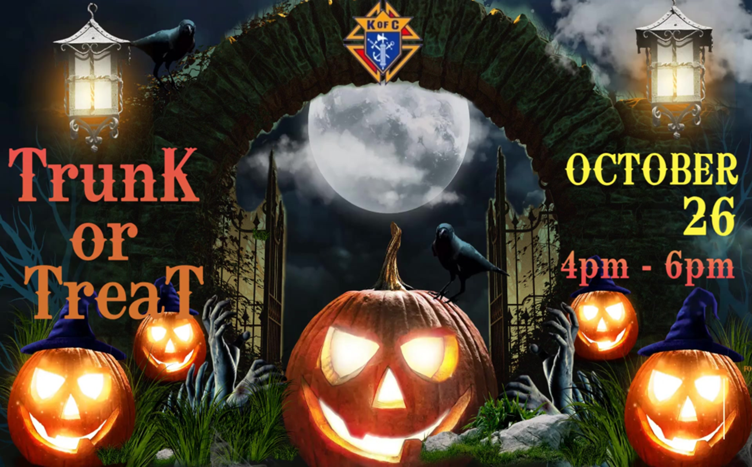 Come enjoy an evening of fun and festivities on Sunday afternoon, October 26th from 4:00pm to 6:00PM. We are in need of people to decorate their car trunks and hand out treats to all the ghosts, ghouls, and goblins! . Prizes for best and second-best trunks will be awarded, as well as a costume contest. The Knights of Columbus will be serving Hot Dogs, Chips and Drinks to all individuals trick or treating or passing out candy! If you are new to Trunk or Treating: you can find pictures on the internet by searching: TRUNK OR TREAT